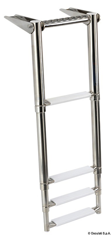 Realizzata in acciaio inox lucidato a specchio. Gradini ovali con pedana in plastica bianca.