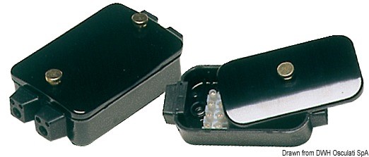 In bachelite, coperchio facilmente rimovibile per ispezione. Completa di morsettiera.