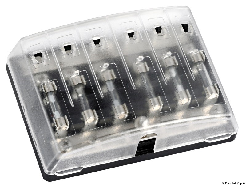 Per fusibili standard 6,3x32 mm. Completa di LED di segnalazione fusibile bruciato.Con coperchio a scatto e tabella con simboli utenze autoadesivi.
