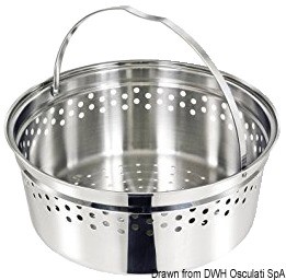 In acciaio inox AISI 316 lucidato a specchio. Utilizzabile anche con fuochi ad induzione. Provvisto di speciali manici a scatto removibili.