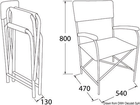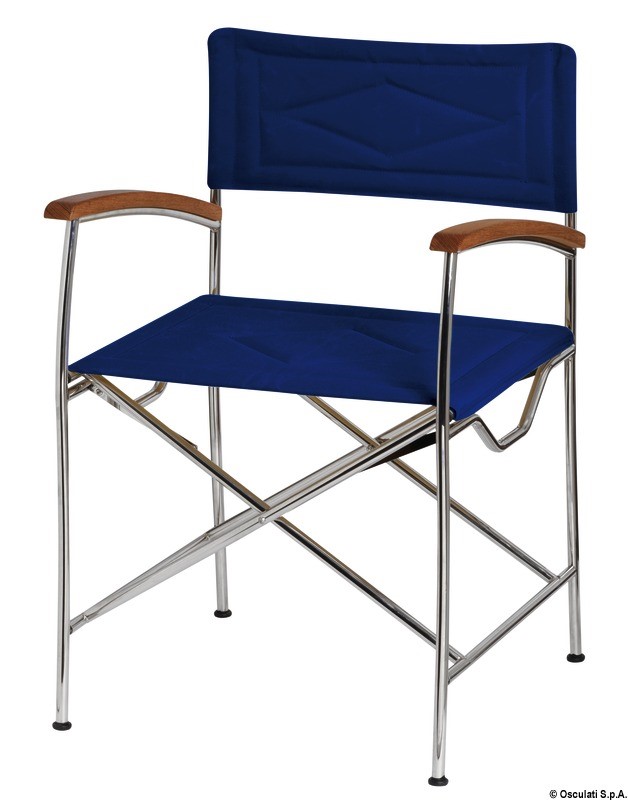 Pieghevole, costruita in acciaio inox AISI 316 lucidato, con seduta e schienale in tessuto "SUMBRELLA" UV resistente con imbottitura interna.