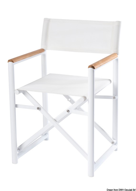 Struttura in lega leggera power coated, braccioli in teak e schienale in batylene resistente ai raggi UV, sole, intemperie, etc.