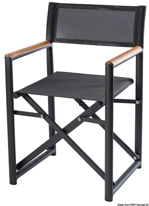 Struttura in lega leggera power coated, braccioli in teak e schienale in batylene resistente ai raggi UV, sole, intemperie, etc.