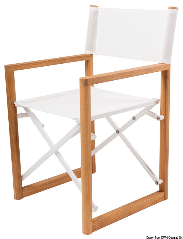 Struttura in lega leggera power coated, braccioli in teak e schienale in batylene resistente ai raggi UV, sole, intemperie, etc.