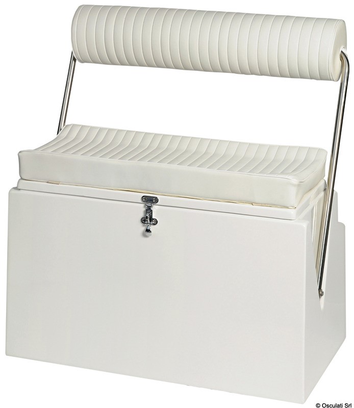 Fabbricato in vetroresina bianca e provvisto di seduta apribile uso gavone e di schienale ribaltabile onde poter usare il sedile fronte marcia oppure verso poppa. La ferramenta è tutta in acciaio inox. La cuscinatura in similpelle bianca.
