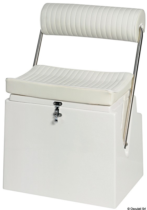 Fabbricato in vetroresina bianca e provvisto di seduta apribile uso gavone e di schienale ribaltabile onde poter usare il sedile fronte marcia oppure verso poppa. La ferramenta è tutta in acciaio inox. La cuscinatura in similpelle bianca.