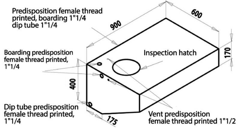 In polietilene lineare alimentare. Sono insapori e inodori. Forniti completi di tappo d'ispezione e predisposizioni per carico, scarico e sfiato. Possibilità d'istallazione modulare di più serbatoi, grazie alla predisposizione di un niplo di collegamento. Tutti raccordi femmina nella stampata in plastica.