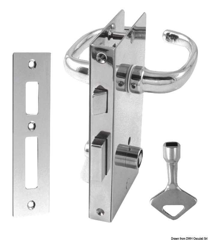 Serrature in ottone cromato da infilare, per porte spessore 15 mm, complete di scontro, coppia placche inox e coppia maniglie 84 mm.