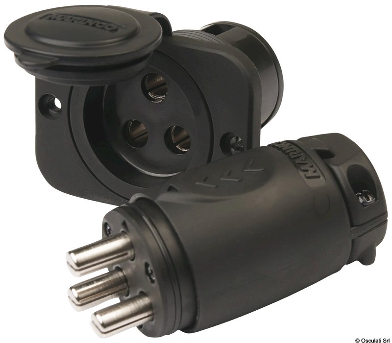 Kit presa e spina per motori elettrici e utenze di bordo con contatti in ottone nichelato, tenuta stagna con cappuccio e accoppiamento “locking” a prova di vibrazioni. Una soluzione plug‑and‑play che copre dal piccolo trolling motor fino ai sistemi più potenti: connessione sicura, impermeabile e a bassa caduta di tensione, pronta per installazioni da 12 a 48 volt.