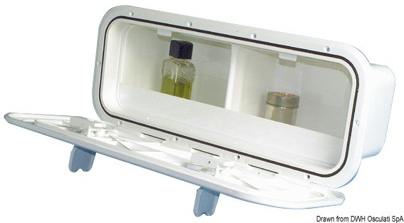 In ABS bianco. Coperchio completamente carenato, nasconde totalmente il telaio. La paratia frontale é ad incastro, pertanto la tasca può essere montata con apertura verso l’alto oppure verso il basso.