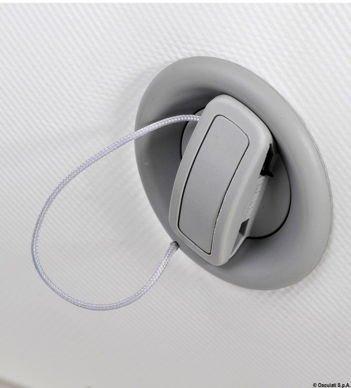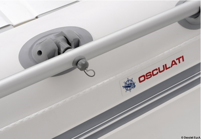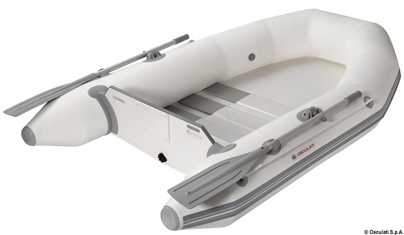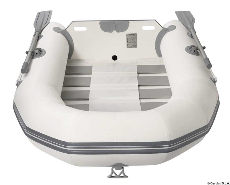 Versione avvolgibile, con fondo piatto irrigidito da stecche trasversali. Fornito completo di remi, gonfiatore e sacca da trasporto.