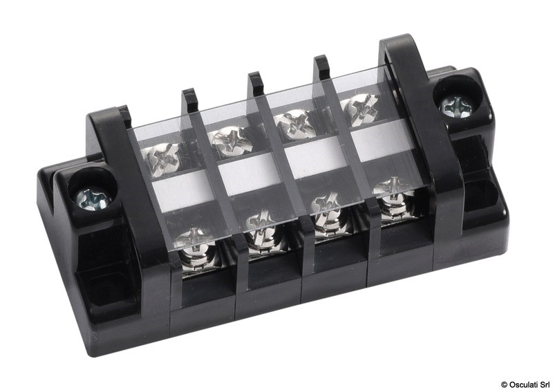 In plastica nera, con fascia trasparente di protezione. Separatori per contatti accidentali. Terminali e viti in ottone nichelato.