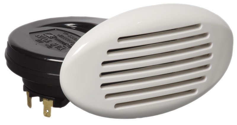 Carcassa in ABS, mascherina bianca. La tromba a membrana con diffusore a chiocciola ha la particolarità di erogare un suono molto potente (nella scala acustica 112 d.b. significano una potenza doppia di 105 d.b.).