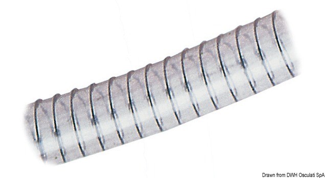In PVC trasparente con spirale in acciaio. Molto morbido, accetta, senza schiacciarsi, curve pari ad una volta il diametro esterno. Ideale per prese e scarichi a mare. Tubo alimentare a norma CE. Temperatura di impiego -10°C +60°C.