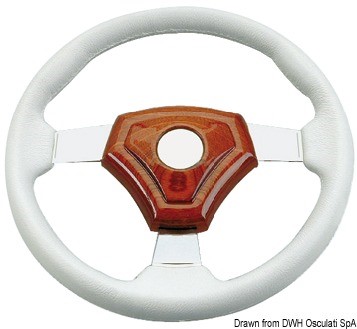 Con coprimozzo centrale in Iroko verniciato ai poliuretani e razze in acciaio inox lucidato a specchio.