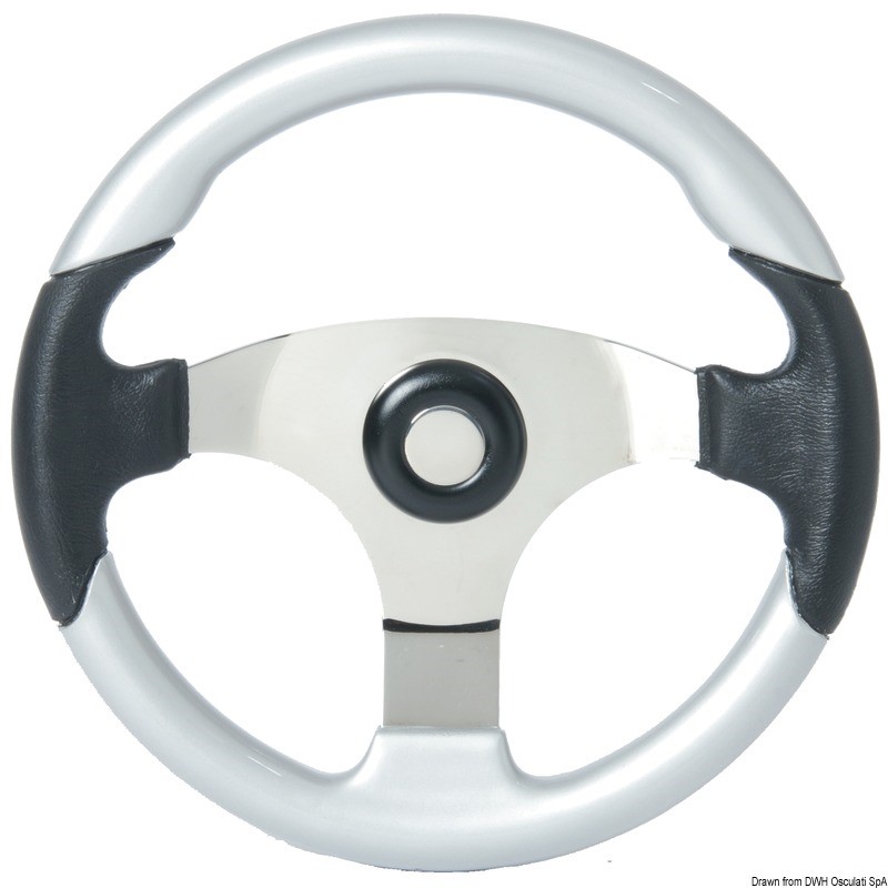Mozzo e razze in acciaio inox lucidato a specchio, corona in morbido poliuretano.