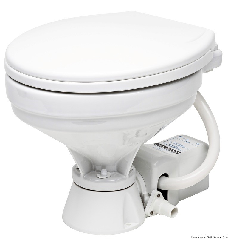 Provvisto di pompa autoadescante in bronzo con girante in neoprene. Funziona premendo un pulsante. Motore a magneti permanenti e albero in acciaio inox, con maceratore incorporato. Sedile e coperchio di colore bianco. Tubo d’entrata da 19 mm (3/4") e d’uscita da 25 mm (1”). Pannello di comando INCLUSO.