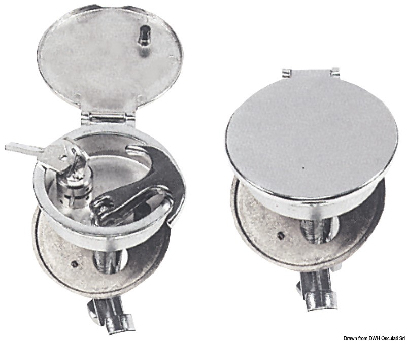 In ottone cromato ad incasso, con coperchio di chiusura. Il tiraggio tramite rotazione della maniglia rende la chiusa più stagna. Regolazione fermo da 5 a 50 mm.