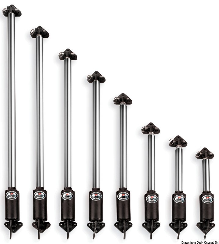 Attuatore lineare garantisce 225 kg di spinta. Cavo da 60 cm e terminale Deutsch plug. Cavi di prolunga disponibili (51.259.xx). Spina di sgancio rapido in acciaio inox. Può lavorare in coppia (usando l’interruttore 38.376.02). Totalmente inossidabile in tutte le sue parti. Sistema di frizione che gli permette di non bruciarsi a fine corsa (estensione e chiusura). Consumo 10 A (12 V) 5 A (24 V).