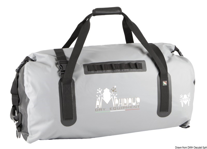 Robusto borsone stagno con fondo piatto trasformabile in zaino di grosse dimensioni tramite spallacci imbottiti (optional). Chiusura Quick Proof, ultra fix per agganciare moschettoni o altro.
