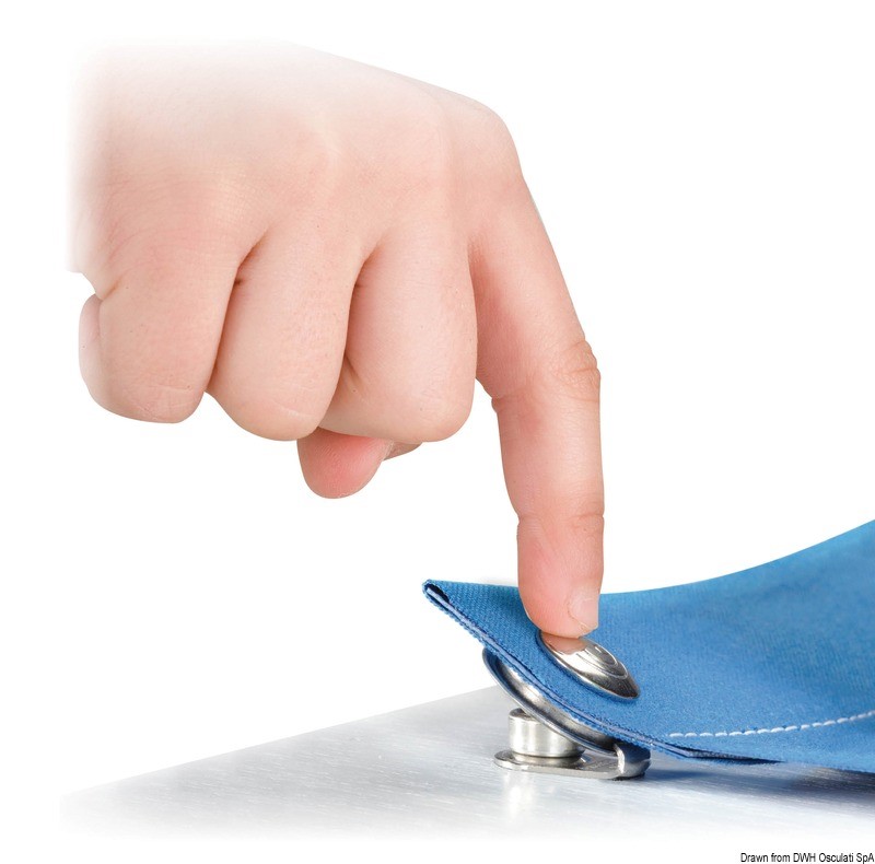 Bottoni in acciaio inox AISI 316. Il maschio presenta un dente di aggancio per la femmina, che a sua volta ha uno specifico labbro di ritegno. Le due novità combinate permettono di tendere al meglio il telo e nello stesso tempo ne evitano lo sgancio accidentale.