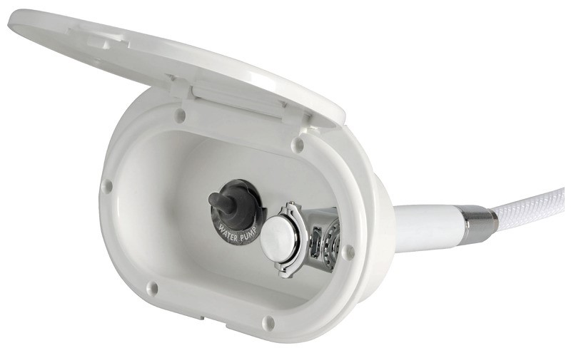 Doccia in ottone cromato, vano di alloggiamento bianco in ASA UV resistente. Da utilizzare su scafi medio-piccoli ove l'uso della doccia è direttamente correlato all'accensione dell'autoclave.