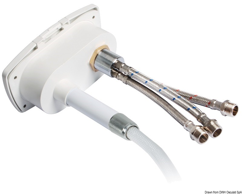Doccia in ottone cromato, vano di alloggiamento bianco in ASA UV resistente. Completa di rubinetto miscelatore acqua calda/fredda. Montaggio in piano o a parete.