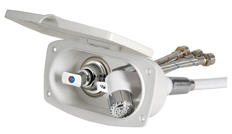 Doccia in plastica con testa cromata, vano di alloggiamento bianco in ASA UV resistente. Completa di rubinetto miscelatore acqua calda/fredda. Montaggio in piano o a parete.