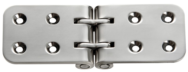 In acciaio Inox AISI 316L lucidata a specchio. Applicabile sul bordo tavolo (spessore min. 19mm). Progettata e realizzata per aver il minor gioco possibile ed ottenere una ribaltina stabile ferma.