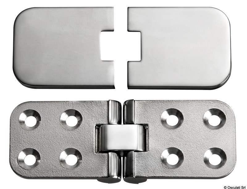 Realizzata in acciaio inox AISI 316 lucidato a specchio. Applicabile per tavoli o portelli con apertura a ribalta. Dotata di cover copriviti applicabile dopo il montaggio per un design pulito e lineare.