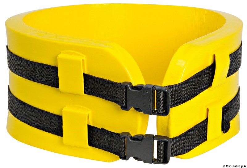Modernissima versione in poliuretano a cellula chiusa, ricoperta in “Vinalux” lucida, gialla, elastica. Cinghia di fissaggio in nylon. Ideale per sci nautico. Due misure.