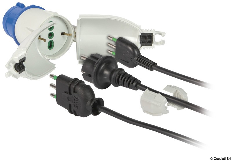 Trasforma le prese da banchina (femmine 16A) a prese civili (Schuko 3 poli piccole o 3 poli grandi). Resistente alla pioggia con un grado di protezione IP44 grazie al sistema di chiusura del cavo posteriore brevettato.