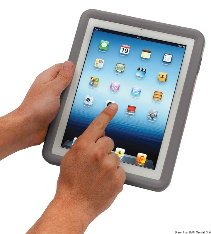 Questa protezione in morbido materiale semirigido, rende il vostro "iPad" antisdrucciolo, antiurto, impermeabile e galleggiante, ed è completata dalla maniglia posteriore di presa in pelle che può essere impugnata con la mano destra o la sinistra. Tutte le funzioni iPad restano invariate: funzione completa di tutti i comandi, attacco jack esterno, attacco caricatore / scarico dati, fotocamera fronte/retro, schermo antiriflesso. Accessorio premiato con il DAME al METS 2011.