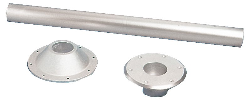 Costituita da due basi in alluminio anodizzato, una da incasso lucidata a specchio, l’altra esterna, più un tubo in alluminio anodizzato del Ø di 60 mm, munita di innesti conici.