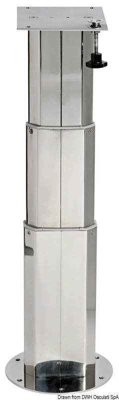 Fabbricato in acciaio inox AISI 316 lucidato a specchio con doppio telescopio azionato da molla a gas. Peso 8 kg, con un aspinta di risalita da 25 kg. Non necessita di forare il pavimento per la discesa.