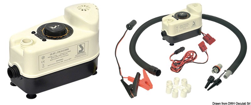 Arresto automatico alla pressione selezionata regolabile tramite manometro. Completo di sacca, tubo lunghezza 1,70 m, cavo alimentazione 3 m ,raccordi universali, spinotto accendisigari e morsetti per batteria 12 V.