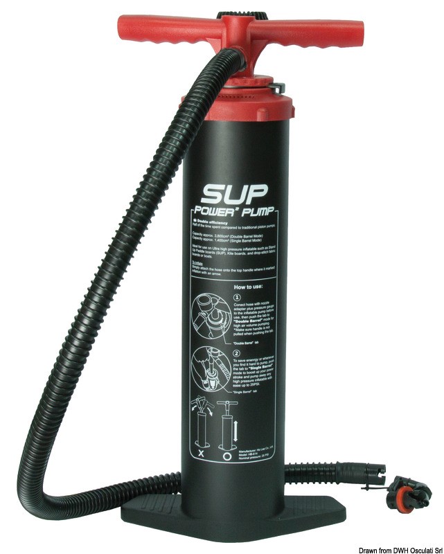 Asse centrale in alluminio. Funziona a doppio flusso oppure a flusso semplice dove sia necessaria alta pressione (max 1,72 BAR/25 psi) per fondi gonfiabili dei gommoni o SUP. Completo di manometro 25 psi.