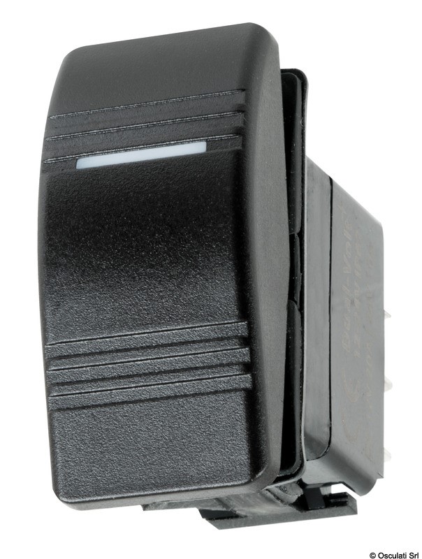Richiedono per l’installazione un foro rettangolare da 21,5x36,8 mm. Capacità max 20 A / 12 V. Bascula rigida e spia luminosa a LED che si illumina attraverso la bascula attivando il contatto.