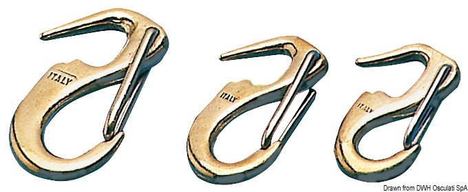 Con fermo a molla in acciaio inox. Si aprono con una sola mano. Presentano il vantaggio, rispetto a quelli similari totalmente in acciaio inox, di essere di materiale più tenero e pertanto non consumano gli stralli inox.