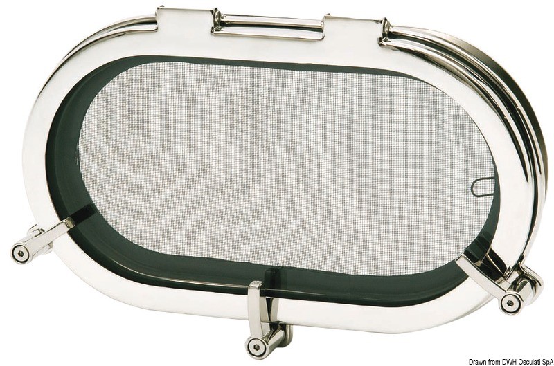 Completamente in acciaio inox AISI 316 lucidato a specchio, serie extra con finitura accuratissime. Caratteristiche: viti di fissaggi esterne invisibili; completi di controflangia esterna; zanzariera in acciaio inox amovibile; galletti di chiusura regolabili, fabbricati in microfusione; parte trasparente in policarbonato ad alta resistenza; approvati CE area 1 categoria 1.