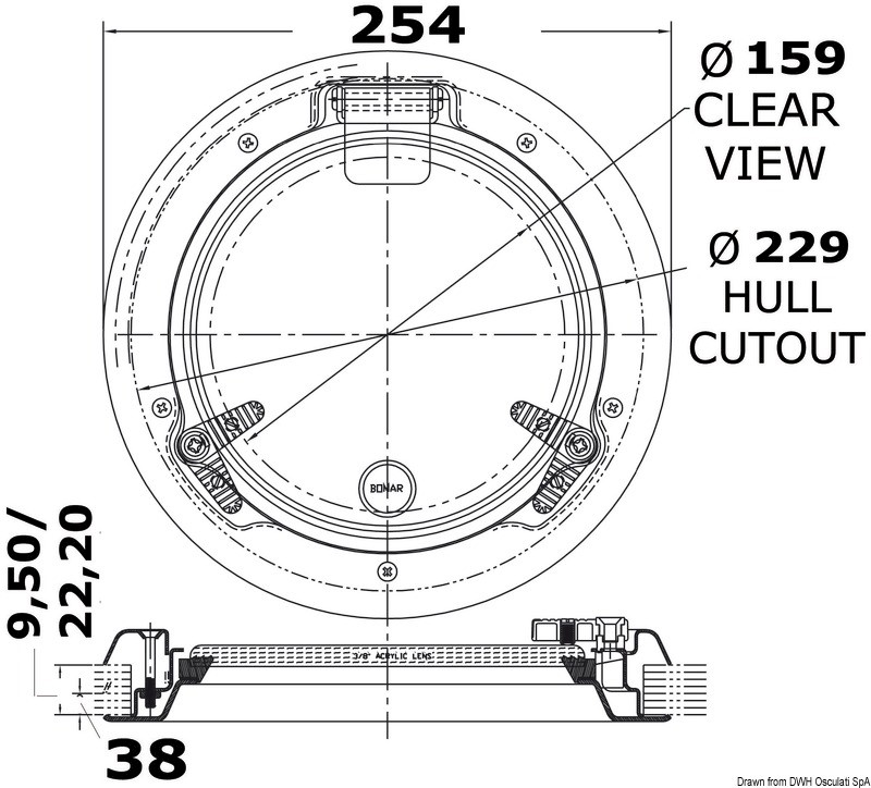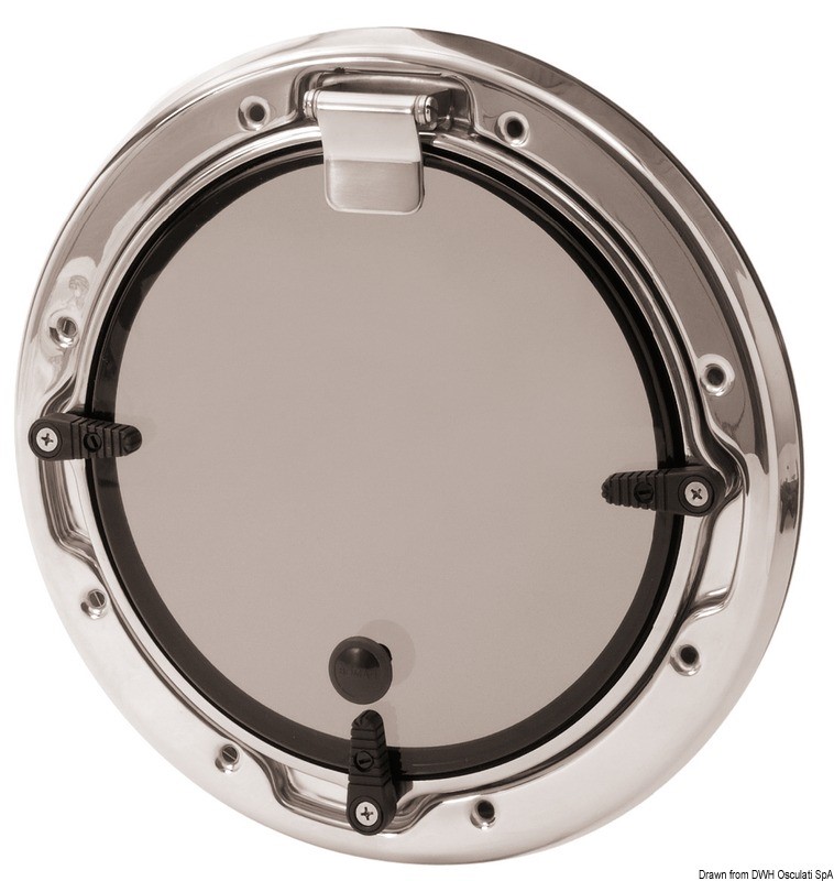 Completamente in acciaio inox AISI 316 lucidato a specchio. Caratteristiche tecniche: 1) Viti esterne invisibili; 2) Ampia superficie trasparente; 3) Completi con controflangia; 4) Galletti di chiusura registrabili; 5) Acrilico fumè; 6) Approvati CE area 1 categoria 1.