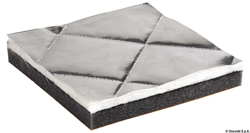 1) Trapunta in fibra di vetro spessore 8 mm 2) Massa EPDM, spessore 2 mm (4 kg/m2); 3) Poliuretano 30 kg/m3, spessore 20 mm; 4) Adesivo Si consiglia la finitura con nastro 65.095.00. Testati secondo la ISO 4589-3 determinando l'indice di ossigeno con prova a temperatura elevata. Certificati da R.I.Na. per l'isolamento acustico di locali apparato motori di unità da diporto fino a 24 m.