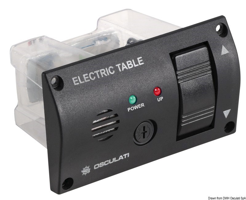 Completo di: interruttore a bascula “Marina” (ON)-OFF-(ON) con ritorno a molla e LED di controllo; fusibile di sicurezza; cover posteriore di protezione cablaggi. Include sensore di posizione che consente di regolare il fine corsa in discesa e di impostare un’altezza di arresto superiore a quella della gamba tavolo totalmente compressa.