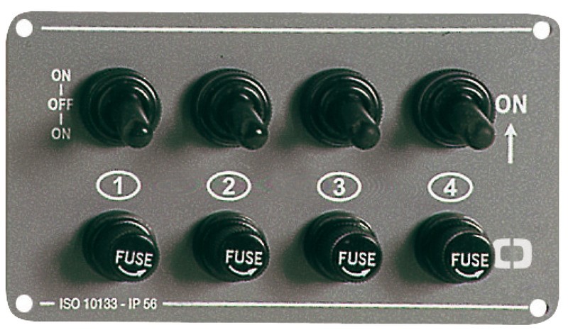 Grado di protezione IP56. Il primo a 3 posizioni (ON-OFF-ON) con 2 circuiti separati, l’ultimo con ritorno a molla per tromba. Carico garantito 15 A con cappuccio in gomma e portafusibili in vetro da 6x32 mm. Pannello in alluminio anodizzato grigia.