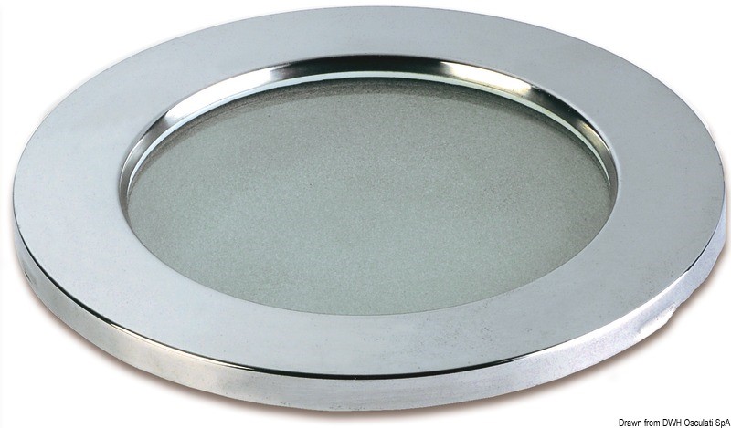 Corpo in tecnopolimero, ghiera in acciaio inox. Lente in vetro temperato e satinato. Parabola interna in alluminio metallizzato. Fissaggio tramite viti nascoste dal frontalino. Lampadina non inclusa.