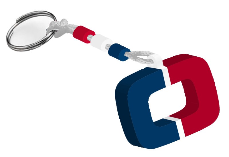 Materiale: EVA 12 mm + supporto centrale in PVC bianco. Laccio bianco con 3 cilindri (blu, bianco, rosso) in EVA e anello in metallo. Misure ingombro: 6x10 cm.