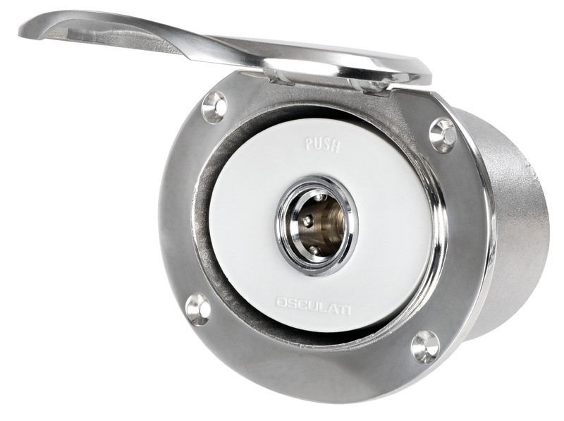 Si collega alla rete idrica di bordo (acqua dolce) o alla pompa Washdown (acqua salata) e mantiene in pressione la linea. Il tubo di lavaggio si innesta a scatto nella presa e fa automaticamente partire la pompa. Vano in acciaio inox 316, sportello autoreggente.