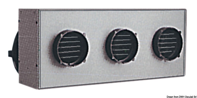 Modello simile al 50.263.01, ma potenziato. Tramite 3 uscite si raggiungono le 3 bocchette orientabili. Kit comprendente riscaldatore + interruttore a pannello a 4 posizioni + staffa montaggio + 5,4 m di tubo Ø 75 mm + 3 bocchette orientabili + cavo elettrico + viti. Sfrutta l’acqua di raffreddamento del motore per trasmettere il calore in cabina. Motore a 3 velocità, montaggio estremamente semplice e veloce.