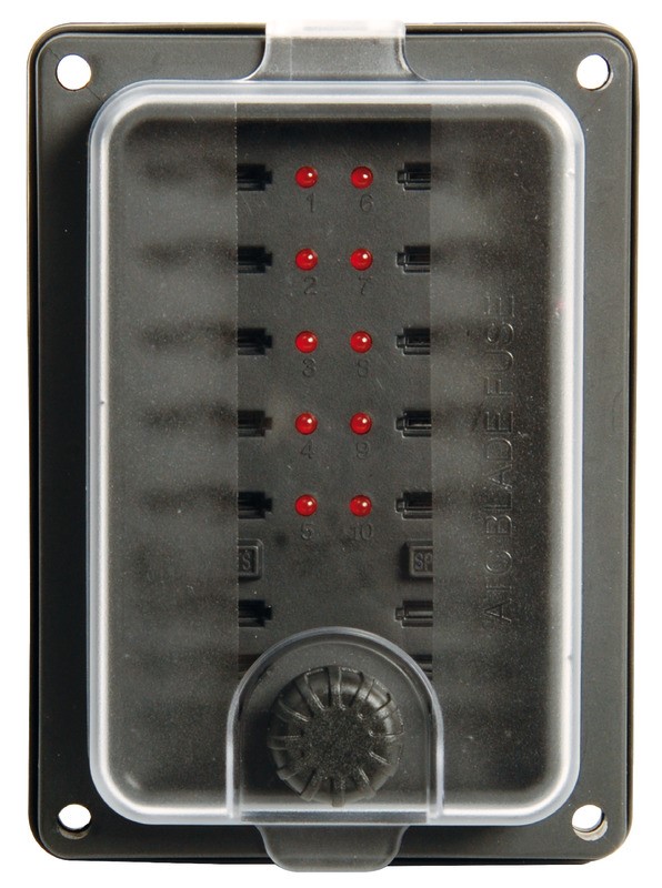 Scatola a semi-incasso con guarnizione in gomma con sedi per 10 fusibili lamellari con uscita posteriore, + 6 sedi fusibili di ricambio, + LED spia per fusibili bruciati.