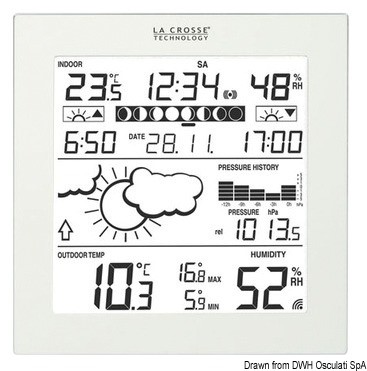 Fornisce: Ora radiocontrollata + calendario fino al 2025 + sveglia con cicalino. Condizioni atmosferiche tramite icone + tendenza. Temperatura / umidità interna (aggiornata ogni 16 secondi). Temperatura / umidità esterna (aggiornata ogni 4 secondi). Fasi lunari. Pressione atmosferica da 960 a 1040 hPa con grafico delle ultime 12 ore.